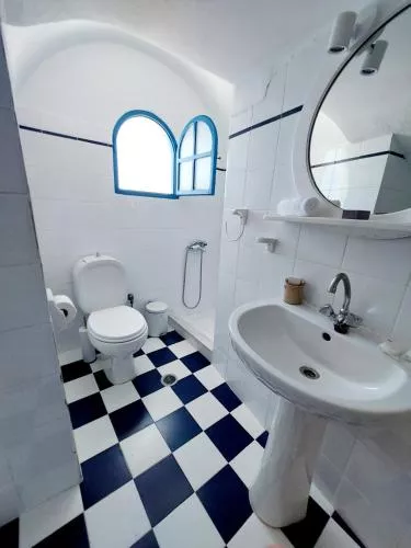 Fiecare cameră cu aer condiționat, decorată cu gust, dispune de o baie privată, o bucătărie cu frigider, televizor prin satelit și un balcon sau o verandă cu o vedere spectaculoasă asupra Mării Egee, vulcanului și apusului de soare.