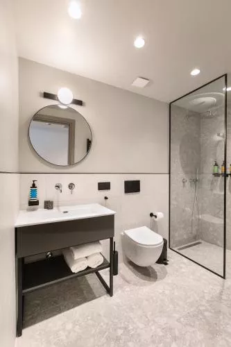 Baie: Halat de baie Prosoape Articole de toaletă gratuite Papuci de casă Uscător de păr Toaletă Duş Hârtie igienică Baie privată Bucătărie: Mașină de cafea Frigider Produse de curățenie General : Seif Pardoseală de lemn sau parchet Fier de călcat Încălzire Izolare fonică Aer condiţionat Vedere: Vedere la mare Accesibilitate: Etaje superioare accesibile cu liftul Media/Tehnologie: TV cu ecran plat TV Telefon Canale prin satelit Dormitor: Paturi extra lungi (> 2 metri) Lenjerie de pat Garderobă sau dulap Servicii: Serviciu de trezire Facilităţile camerei: uscător de rufe Priză lângă pat Caracteristicile clădirii: Apartament privat în clădire Mâncăruri și băuturi: Aparat pentru prepararea de ceai/cafea Minibar Distanțare fizică: Aer condiționat individual pentru fiecare cameră de la proprietate Curățenie și dezinfectare: Dezinfectant pentru mâini