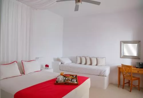 Dimensiuni: 45 mp Numar de camere: 1 camera Această suită spațioasă în plan deschis oferă 1 dormitor cu pat dublu, o cameră de zi confortabilă, cu canapele extensibile, precum și un balcon cu vedere panoramică la Marea Egee. Baia are duș.