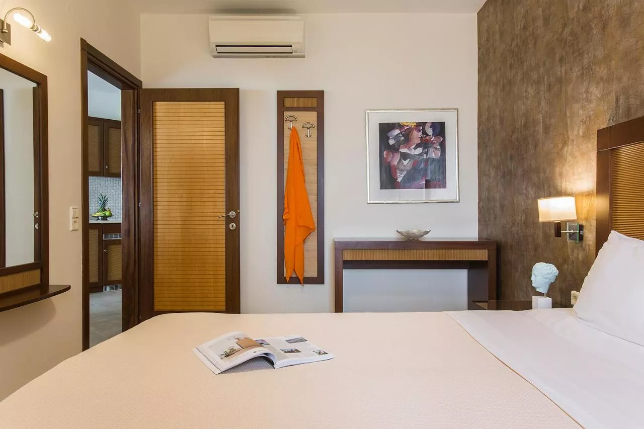 Dimensiuni: 40 mp Numar de camere: 1 camera Această suită de pe malul mării este dotată cu facilități moderne și elemente unice de arhitectură. Are vedere magnifică la plajă și la Muntele Olympus. Este dotată cu TV prin satelit.