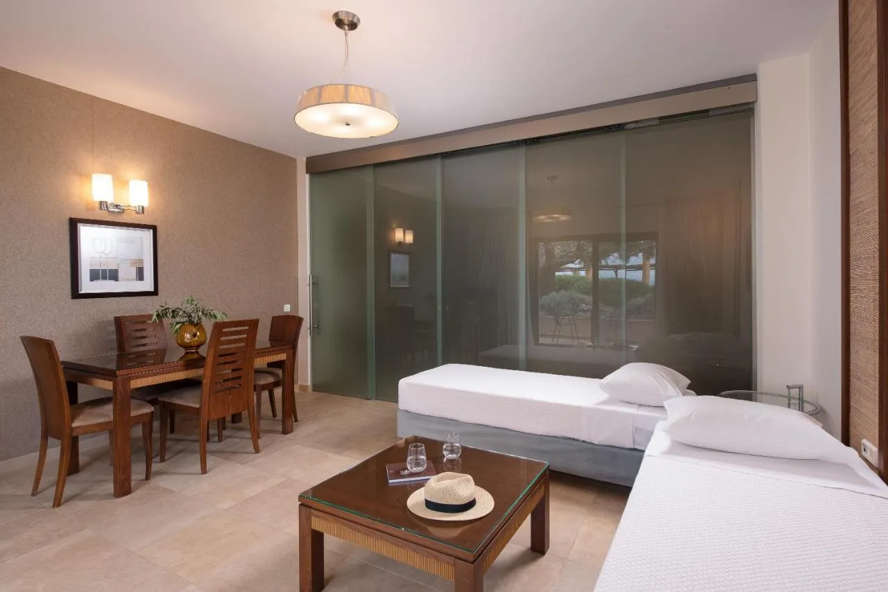 Dimensiuni: 45 mp Numar de camere: 4 camere Situată la parter sau la etajul 1, această suită cu aer condiționat are vedere la grădină. Include un dormitor separat, cu ușă de legătură și un living cu 2 canapele care se pot transforma într-un pat dublu și unul de o persoană. Este decorată modern și are frigider, TV LCD cu canale prin satelit și WiFi gratuit. De asemenea, sunt disponibile halate de baie, papuci și prosoape de plajă. Baie privată cu duș