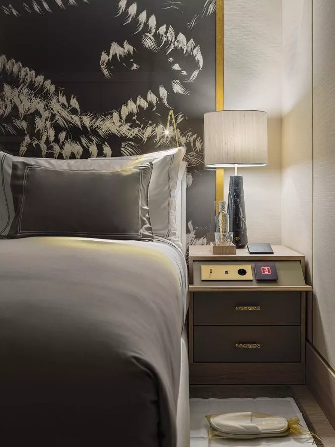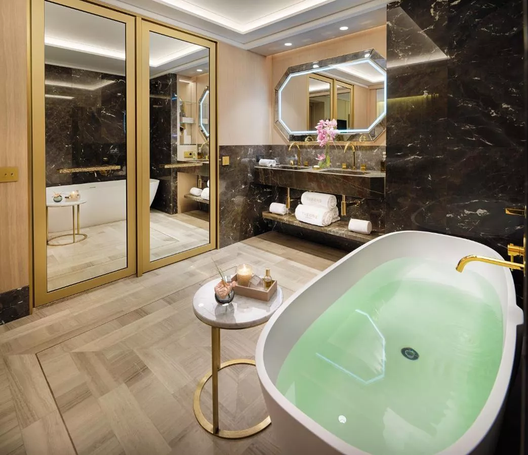 Located in the central part of the façade, the 40 m² (430 ft2) suite overlooks the city and is flooded with natural sunlight, thanks to its large windows, which can be opened to get a real feel of the city. The bedroom and lounge area in a single space provide a way to enjoy the best views of the iconic Barcelona Eixample district. The majestic free-standing bathtub takes on the leading role in the bathroom.