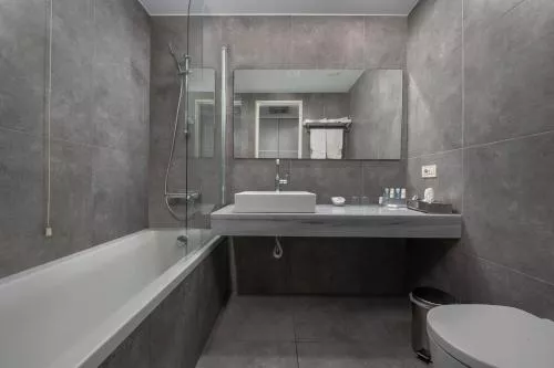 Dimensiuni: 32 mp Numar de camere: 3 camere The spacious twin/double room provides air conditioning, soundproof walls, a terrace with an inner courtyard view as well as a private bathroom featuring a bath. Baie privată cu cadă
