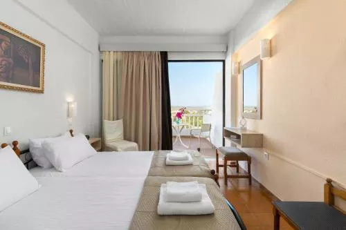 Toate camerele de la Hotelul Panorama au un balcon privat cu vedere la mare, pardoseală cu gresie și aer condiționat reglabil, asigurând un sejur relaxat pe insulă.