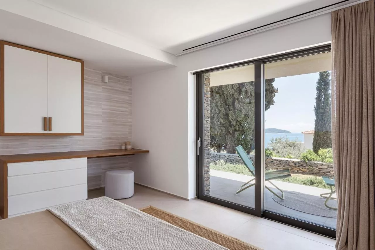 Vila de 132 mp este situată pe coasta de est a Skiathos, în Golful Achladies, un pitoresc sat grecesc care încă păstrează farmecul unui sat de pescari. Plaja cu nisip formează o mică golfuleț și este înconjurată de vegetație luxuriantă care înconjoară apele cristaline albastre. Situată la 2 km de capitală, oferă un cadru relaxant cu restaurante bune în jur, precum și transport ușor (pe drum sau pe mare) cu taxiuri acvatice care duc vizitatorii în orașul Skiathos.