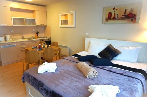 This spacious deluxe apartment features modern design and a terrace with a mountain view and fully equipped kitchen with dinning area. It has two bedrooms, one with queen-size bed and the other one with a single bed. There is an additional bed in the living room with size 140 x 200 cm. The apartment has a corner sofa, a real-wood fireplace, two LCD TVs and a terrace access from the living room and the main bedroom. The bathroom has toilet, sink and a shower cabin. It is located on 4th floor close to facilities. Elevator goes to the 3rd floor, last floor can be accessed by foot. Free amenities include full range of Duck Island cosmetics, as well as towels, bathrobes and slippers for both adults and children. Amenities for babies such as baby cot, baby mattress, duvet, pillow, blanket, baby bathrobe, changing mat, play mat, baby bath, organic baby cosmetics are provided for families with babies free of charge, as long as they are included in the reservation.