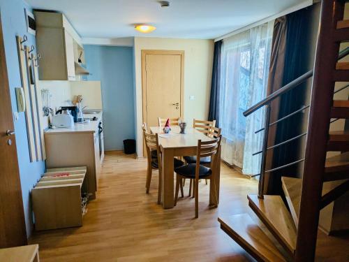 This spacious maisonette with two floors, two bedrooms and two bathrooms can accommodate up to six persons without using sofa-beds, offering comfort and privacy for bigger families or for a group of friends. On the first floor there is a living-room with a seating area with LCD TV and a real-wood fireplace, fully equipped kitchen with dining area, a single bed, a terrace with a mountain view and a bathroom with shower-cabin, toilet and sink. On the second floor there are two bedrooms - one with a queen-size (160 x 200 cm) double bed, the other with a queen-size (160 x 200 cm) double bed and a single bed and another LCD TV. Between them is located the second (auxiliary) bathroom with a toilet, sink and hand shower. The Family Maisonette with two bedrooms with a mountain view is located on the top two floors, close to the Reception, Lobby bar and Spa in a secluded quiet location with only three other apartments on the same corridor. Please keep in mind that part of the living-room and the whole second floor of this apartment are attic and there is a spiral staircase leading from the first to the second floor, so this apartment might be a better option for adults or families with older children. Free amenities include towels, bathrobes, slippers and a full range of luxury Duck Island cosmetics. Free amenities for children include bathrobes, slippers, kids’ step stool and special organic cosmetics for children.