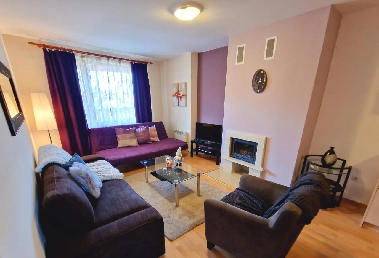 This cozy apartment with one bedroom is an ideal choice for couples, three adults, as well as for families with one child. It features a separate bedroom with a queen-size double bed (160 x 200) and a living room with a fully equipped kitchen, dining area, a comfortable sofa bed and a real-wood fireplace. The bathroom is equipped with a shower cabin, a toilet and a sink and it is a bit smaller than in the other one-bedroom apartments. For a better comfort of our guests, this apartment has two LCD TVs (one in the bedroom and the other one in the living-room) and a DVD player. Free amenities include towels, bathrobes, slippers and a full range of luxury Duck Island cosmetics. Free amenities for children include bathrobes, slippers, kids’ step stool and special organic cosmetics for children. All apartments of this type have a very small balcony with a view of the river, the city and the mountains or with a garden view (the view depends on availability and cannot be guaranteed by request, but we will do our best to comply with your preference). Please keep in mind that in this type of apartment there is no space to put a baby cot in the bedroom.