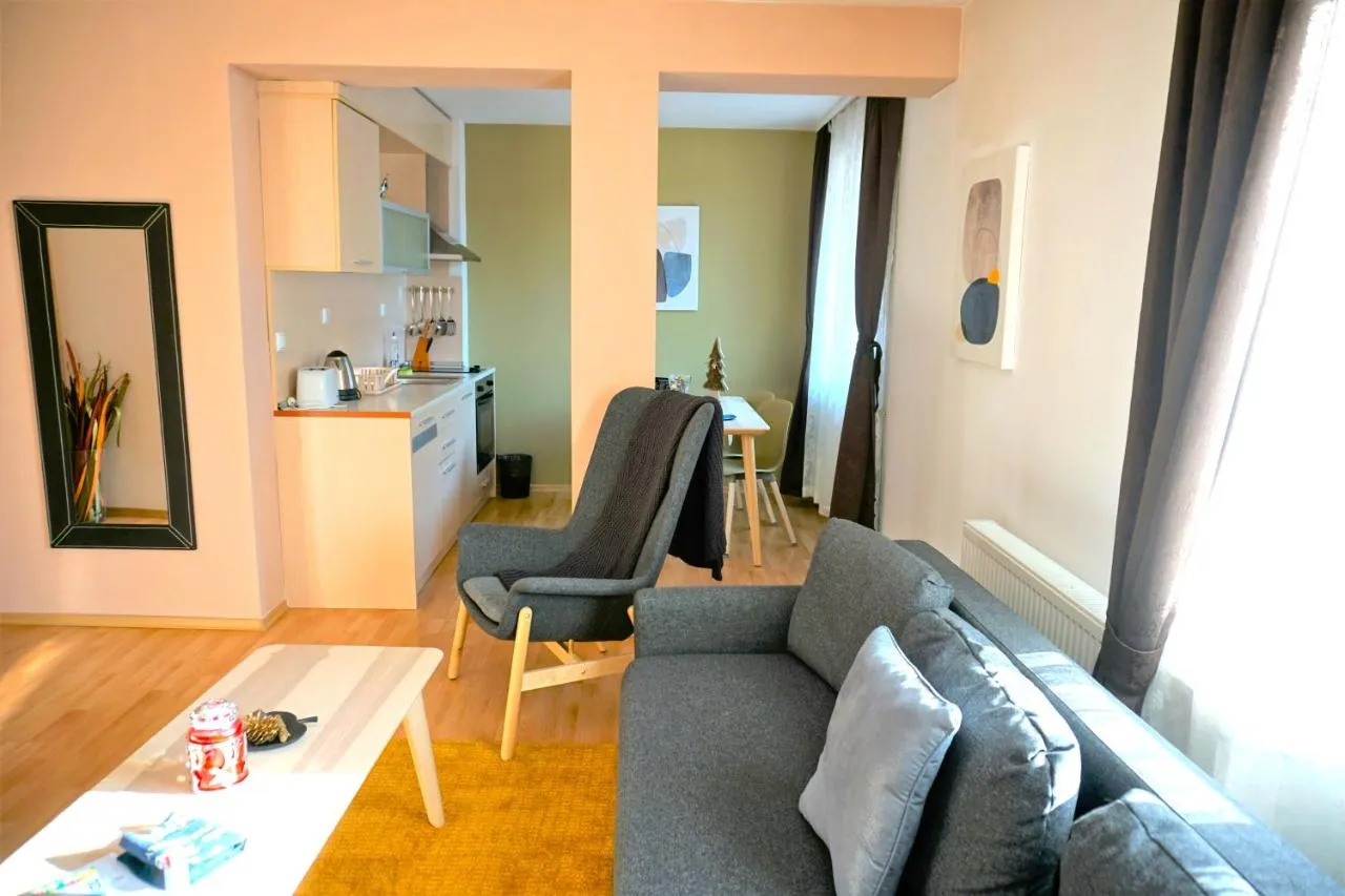 This spacious one-bedroom apartment with modern design is ideal for bigger families, as it allows for up to four adults to sleep on the beds and additional two children on a sofa-bed. It is perfect for families with babies and small children, as there is enough space to put a baby cot or a child bed both in the bedroom and in the living-room. A separate large bedroom features a king-size double bed (180 x 200 cm), a TV, a work desk and a chest of drawers. The living-room has another double bed (140 x 200 cm or 160 x 200 cm), a comfortable sofa bed and an electric fireplace. There is a fully equipped kitchen with dining area and a spacious bathroom with shower-cabin, toilet and sink. It has two LCD TVs, one in the living-room, the other one in the bedroom and a DVD player. There is a corridor with a wardrobe and storage space. Free amenities include towels, bathrobes, slippers and a full range of luxury Duck Island cosmetics. Amenities for babies (changing mat, play mat, baby bath, baby cosmetics) as well as baby bathrobes are provided for families with babies free of charge, as long as they are included in the reservation. Free amenities for children include bathrobes, slippers and special organic cosmetics for children. This apartment has a river-view and it does not have either a balcony or a terrace.