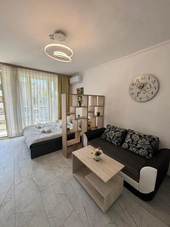 Cu o cazare cu aer condiționat, piscină privată, vedere la grădină și terasă, Прекрасно студио se află în Sunny Beach. Această proprietate pe plajă oferă acces la un balcon. La apartament este disponibil și un loc de ședere în aer liber.