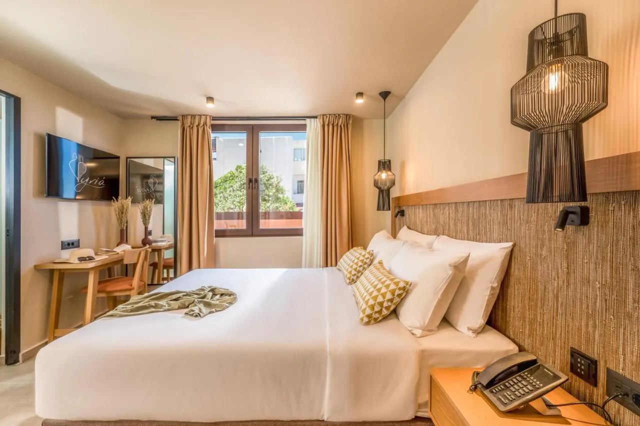 Hotelul Pyriá dispune de o piscină exterioară sezonieră, grădină, un lounge comun și terasă în Piskopianon. Acest hotel de 4 stele oferă un serviciu de recepție non-stop, servicii de concierge și WiFi gratuit. Anumite unități de cazare de la proprietate au un balcon cu vedere la mare.