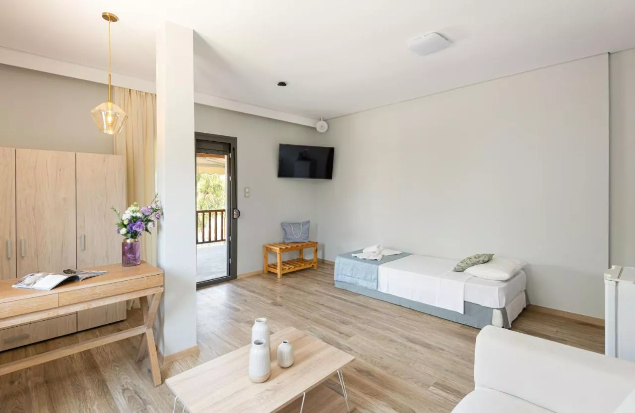 Înconjurat de un grădină, chiar pe malul mării în Paradeisos, Regos Resort a fost renovat complet în 2021 și a fost transformat într-un hotel de 3*** stele, oferind acum 7 Suite, 9 Camere și doar 1 Apartament de familie cu bucătărie.