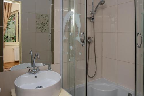 Dimensiuni: 17 mp Numar de camere: 2 camere Această cameră este situată în turnul vilei. Oferă vedere frumoasă la munții din jurul orașului Sinaia. Unitatea are 2 ferestre în formă de semicerc cu vitralii, o baie nouă şi un pat king-size.