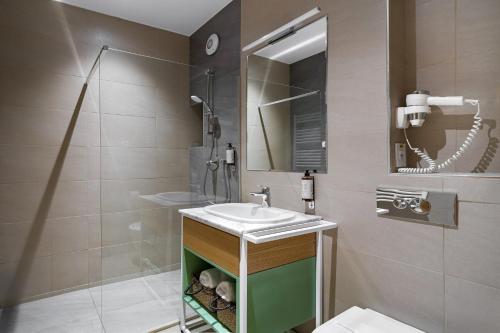 Dimensiuni: 45 mp Numar de camere: 10 camere Featuring a private entrance, this air-conditioned suite consists of 1 living room, 1 separate bedroom and 1 bathroom with a walk-in shower and a bath. The well-equipped kitchenette features a refrigerator, kitchenware, a tea and coffee maker and a toaster. Boasting a terrace with city views, this suite also provides soundproof walls and a flat-screen TV with streaming services. The unit offers 2 beds.