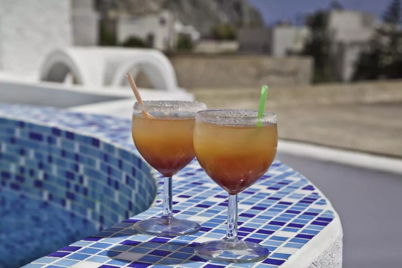 Oaspeții pot savura o băutură în zona barului de la piscină.