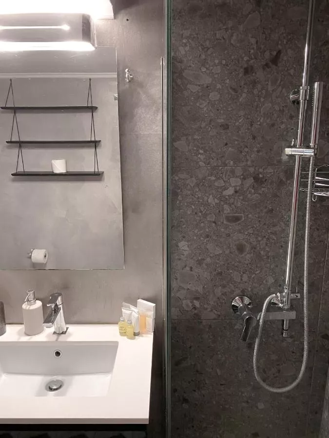 The extra bed measures 90x190 cm and is suitable for a child. Private bathroom with shower