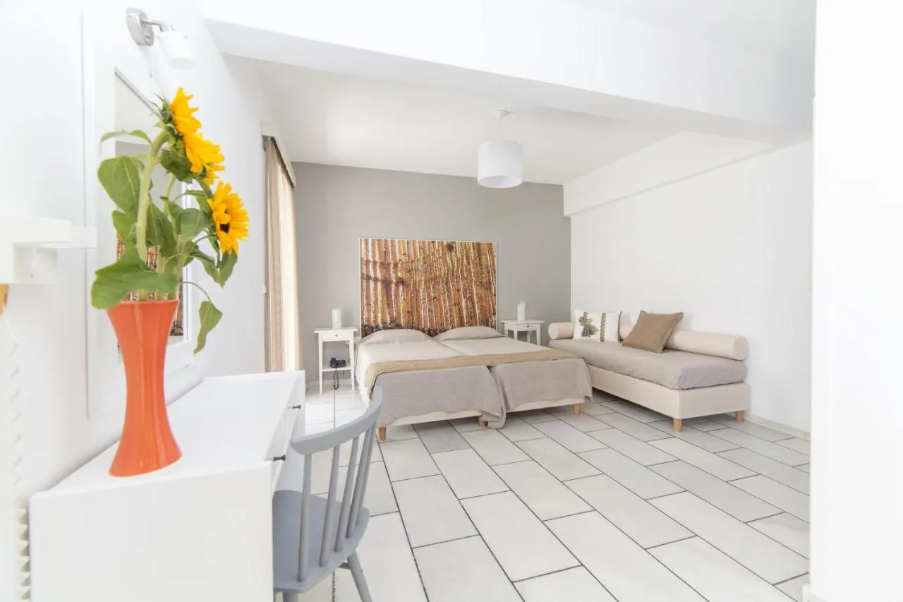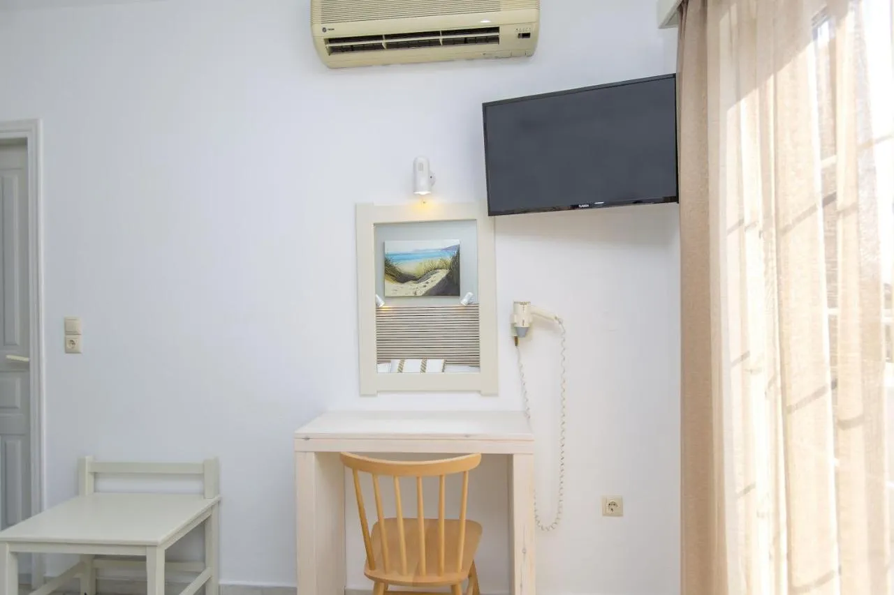 Camerele sunt decorate într-un stil simplu cicladic și sunt dotate cu aer condiționat, frigider, fierbător și uscător de păr. Fiecare cameră are, de asemenea, un televizor inteligent cu serviciu de streaming gratuit, de exemplu Netflix. WiFi gratuit este disponibil în zonele publice.