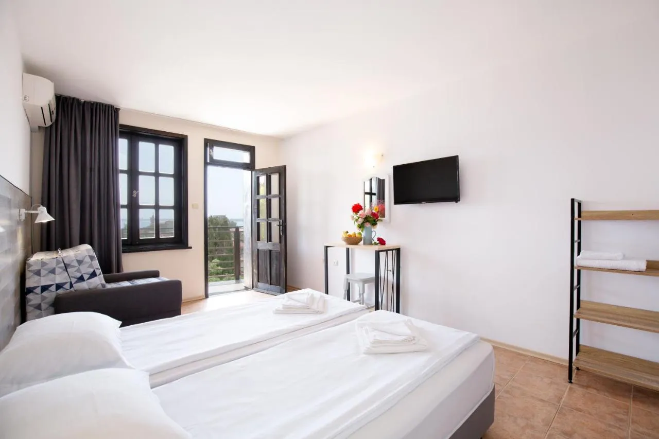 Dimensiuni: 22 mp Numar de camere: 18 camere This air-conditioned twin/double room is comprised of a flat-screen TV with cable channels, a private bathroom as well as a balcony with sea views. The unit has 2 beds and 1 futon.