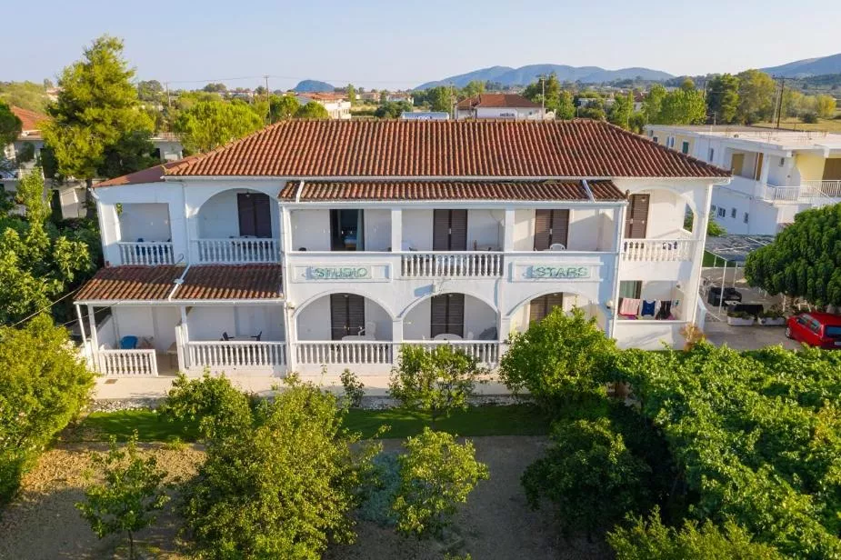 Studio Stars este situat la 1 km distanță de centrul animat al orașului Laganas și la 2 km de plaja Laganas. Oferă cazare cu autoservire într-un grădină cu copaci de citrice.