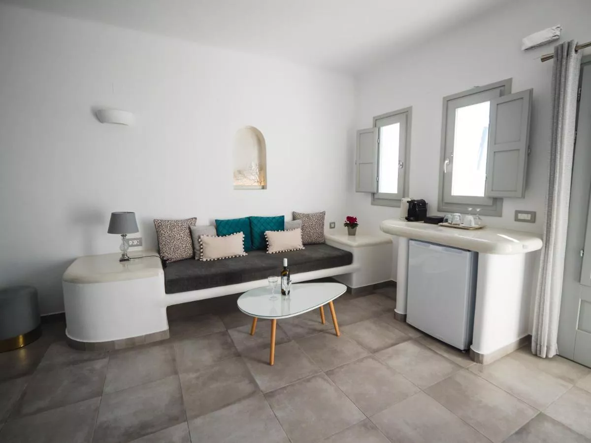 Încântătoarele camere cicladice și suitele luxoase sunt climatizate și au paturi din beton. Fiecare este echipată cu un seif, televizor prin satelit și o baie privată cu produse de toaletă gratuite.