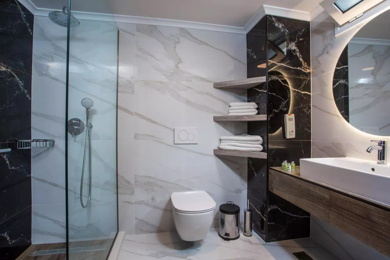 Dimensiuni: 33 mp Numar de camere: 1 camera This suite's special feature is the pool with a view. The air-conditioned suite features 1 bedroom and 1 bathroom with a walk-in shower and a hairdryer. Featuring a terrace with sea views, this suite also provides a wardrobe and a flat-screen TV with satellite channels. The unit offers 3 beds. Baie privată cu duș