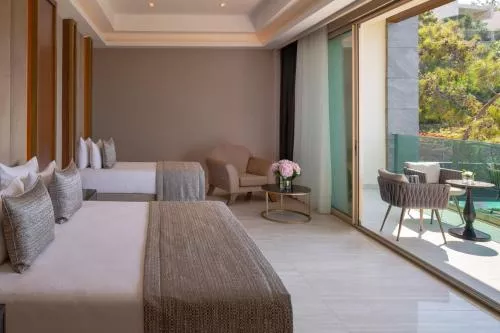 Dimensiuni: 75 mp Numar de camere: 2 camere Această suită spațioasă include 2 dormitoare separate, zonă de relaxare și birou. Baia privată are duș, uscător de păr, papuci și halat de baie. Această suită oferă vedere la mare. Baie privată cu duș