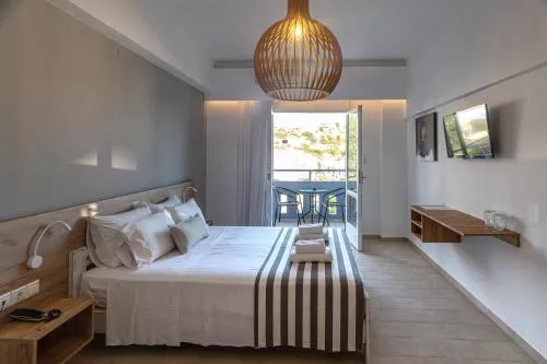 Dimensiuni: 30 mp Numar de camere: 10 camere Just 10 metres from the beach, this room overlooks the Libyan Sea from its furnished balcony. It offers air conditioning, TV (doesn't show Greek channels), mini fridge and a hairdryer in the bathroom. Baie privată cu cadă
